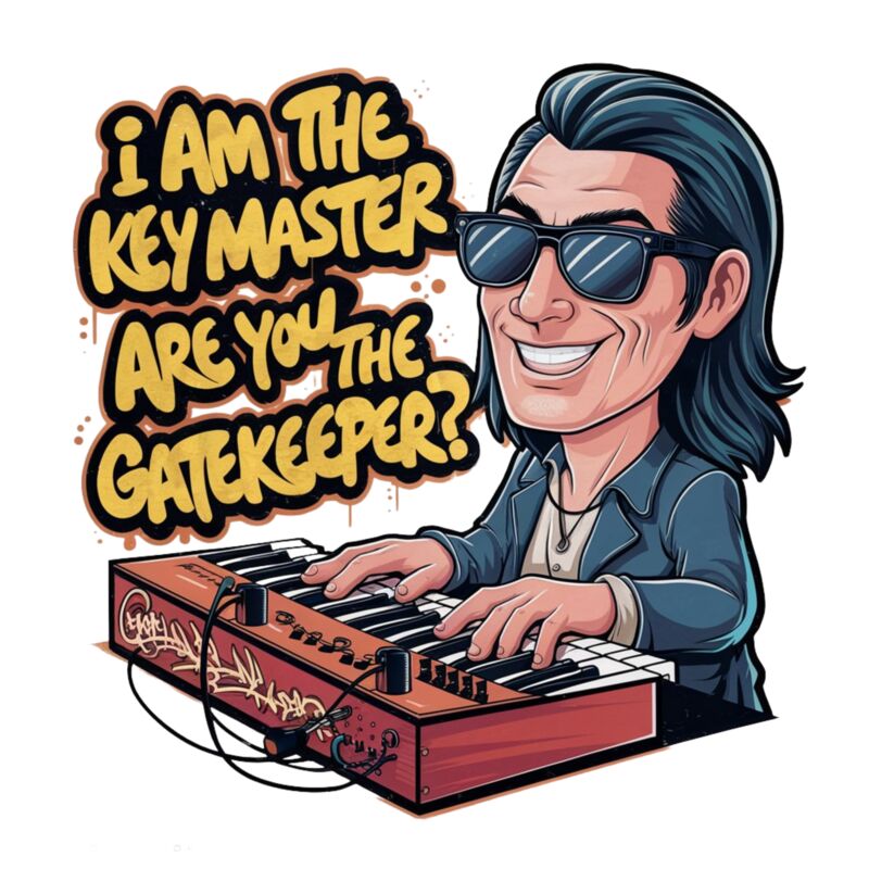 A cartoon character playing a Synthesizer featuring the words "I am the keymaster, are you the gatekeeper"
