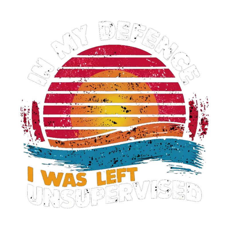 Retro sunset style graphic t-shirt design featuring the phrase 'In My Defence, I Was Left Unsupervised'