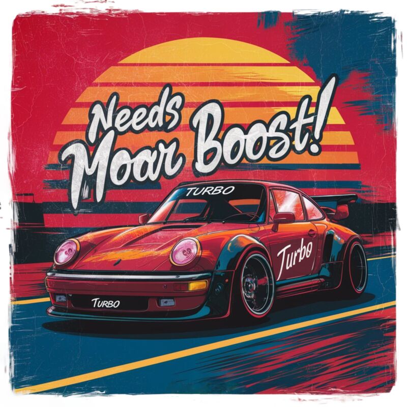 A race car on a track featuring the words "needs moar boost"