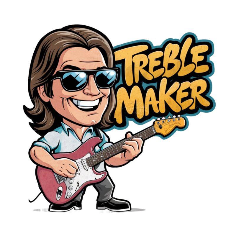 A cartoon character playing an electric guitar featuring the words "Treble Maker"